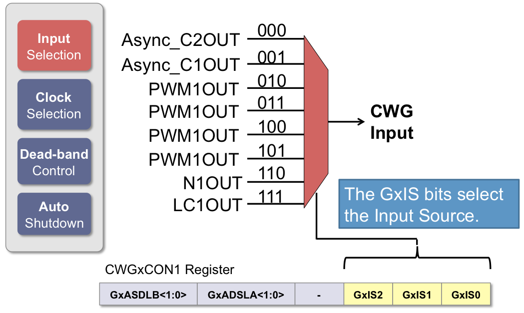 The input source is selected using the GxIS<2:0> bits in the CWGxCON1 register.