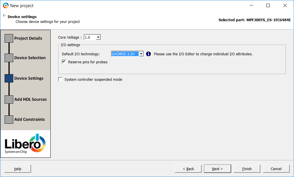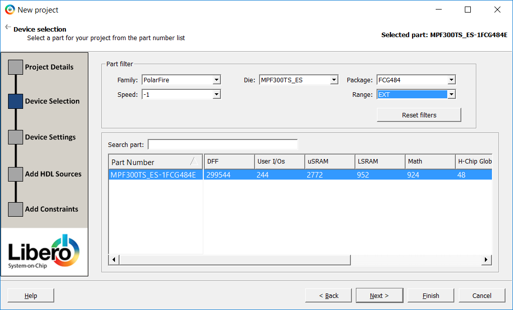 4) This tutorial uses the standard MPF300T on the development board. Enter the following in the Device Selection pane of the New Project dialog box then click Next: