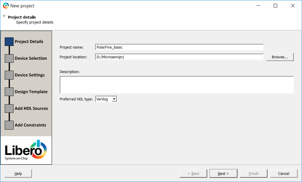- Project Name: PolarFire_basic (Note: name is case sensitive for Verilog designs.)