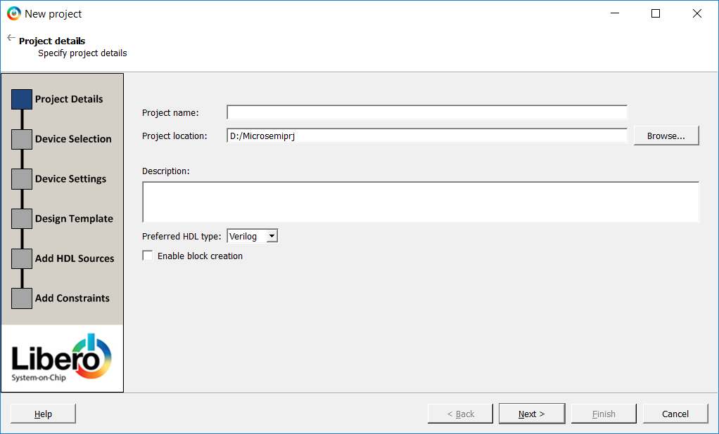 The first step in an FPGA design is to open Libero SoC and create a blank project.