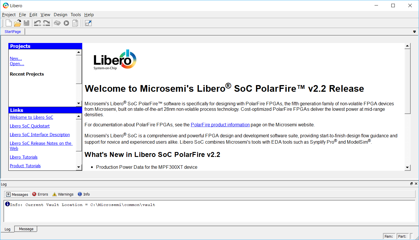 1) Click Start > Programs > Microsemi Libero SoC v12.x > Libero SoC v12.x, or click the shortcut on your desktop. The Libero SoC PolarFire Project Manager opens, as shown below.