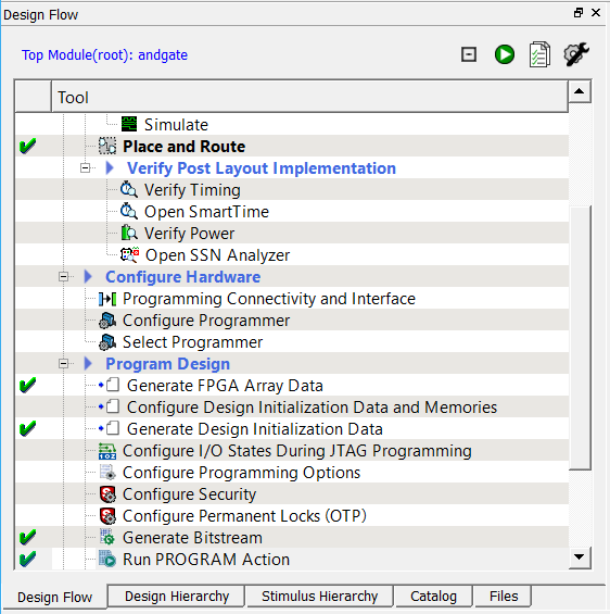 A green check mark will appear next to the Program Design and Run PROGRAM Action in the Design Flow window, to indicate programming completed successfully.