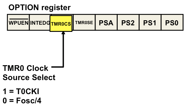 Timer mode is selected by clearing the TMR0CS bit of the OPTION_REG register.