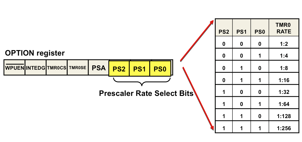 A software programmable prescaler is available for exclusive use with Timer0. The prescaler is enabled by clearing the PSA bit of the OPTION_REG register. There are eight prescaler options for the Timer0 module ranging from 1:2 to 1:256. The prescale values are selectable via the PS<2:0> bits of the OPTION_REG register. In order to have a 1:1 prescaler value for the Timer0 module, the prescaler must be disabled by setting the PSA bit of the OPTION_REG register.