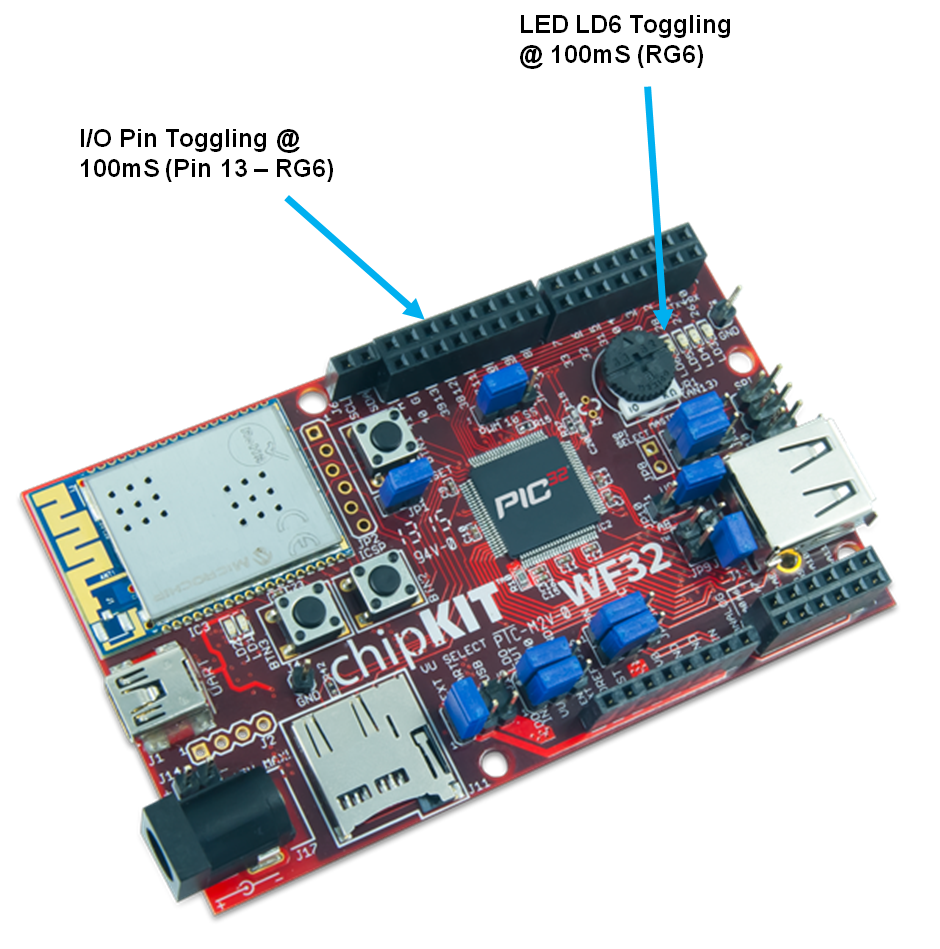 On a successful programming of the WF-32 board with this project, LED D6 (PIC32 Pin RG6) should be toggling every 100 mS. The toggle rate can me measured at pin 13 of the digital header as shown: